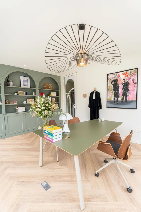 Chaque matériau a été choisi pour offrir douceur visuelle et tactile. L’agencement sur mesure, des bureaux aux armoires, reflète l’identité de chaque collaborateur tout en créant une harmonie d’ensemble.
