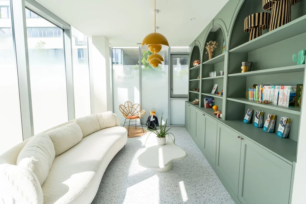 La confidentialité, pilier du projet, se traduit par des cloisons acoustiques, des vitrophanies dégradées et des portes boisées qui assurent intimité tout en apportant une touche de chaleur. Chaque espace, baigné d’une lumière soigneusement étudiée, intègre des suspensions et des détails personnalisés, faisant de ce cabinet un lieu unique où il fait bon travailler.